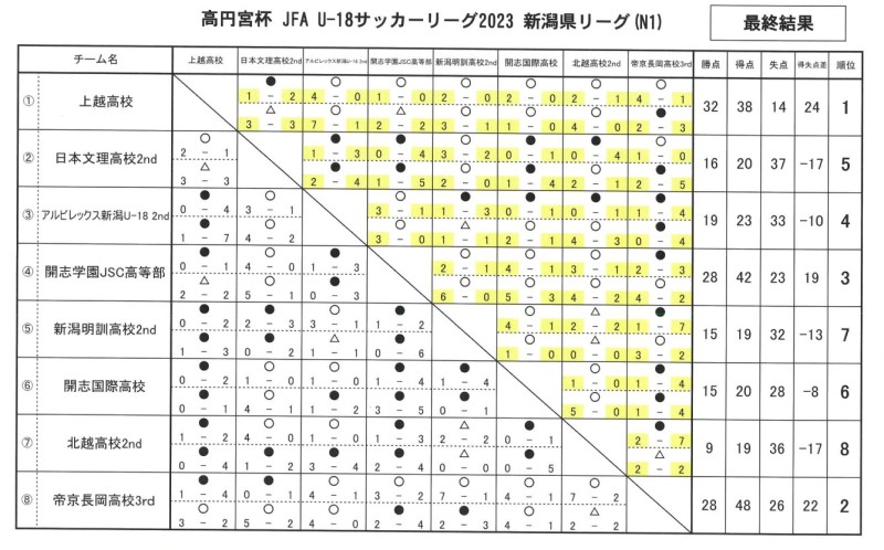新潟県1部リーグは14試合中10勝2敗2分の勝点32で優勝しました! 最終順位、1位と2位のチームは北信越プリンスリーグ参入戦へ進出します。 そこから各県の代表と昇格を競います。参入戦から北信越プリンスリーグへ昇格できるのは2チームです。 11月25、26日に北信越プリンスリーグ参入戦が石川県能登島で行われます。 応援よろしくお願いします!
