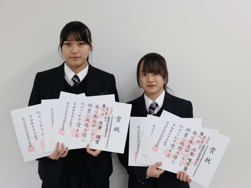 今年度から立ち上がった本校の新体操部。 部員は2人ですが、精力的に活動しています。 10月29日(日)に新潟市西総合スポーツセンターで行われた上越地区大会では、優勝・準優勝に輝きました。 現在は12月に出場する東京での大会を目指し、練習に励んでいます。