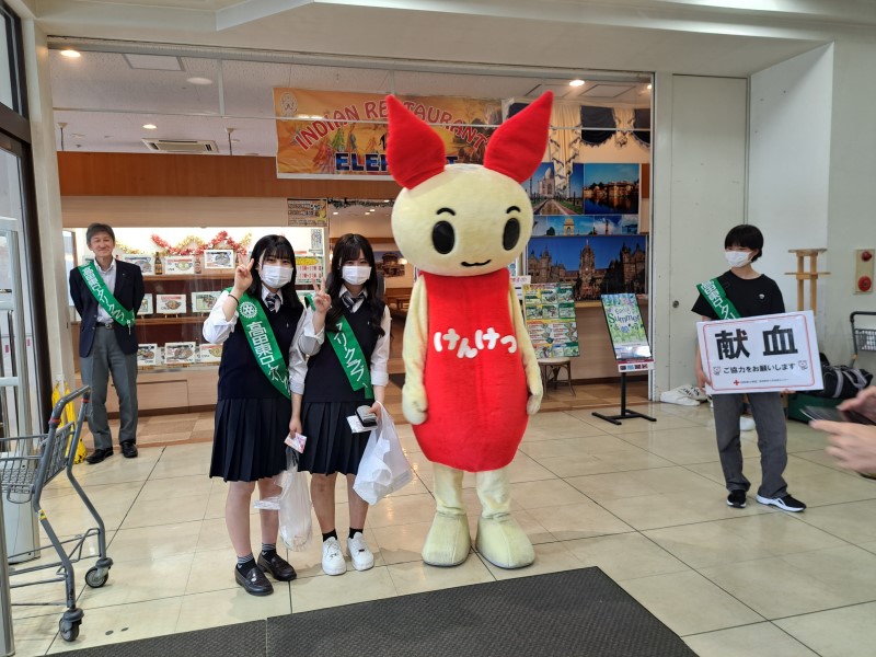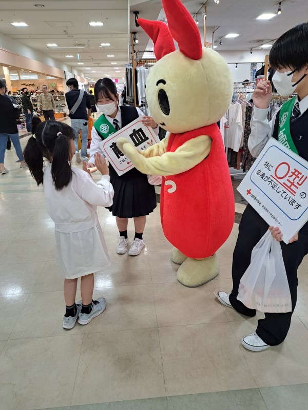 5月19日(日)イオン上越店にて献血が行われ、その啓発活動を高田東ロータリークラブ、関根学園高等学校インターアクトクラブと合同で行いました。本校のインターアクトクラブ員は17名参加し、ティッシュを配布したり「献血くん」の着ぐるみを着て呼びかけたりしました。4,5月は例年献血する人が不足するそうですが、今回、高校生4名が200mlの献血を体験し、赤十字社からも感謝の言葉をいただきました。