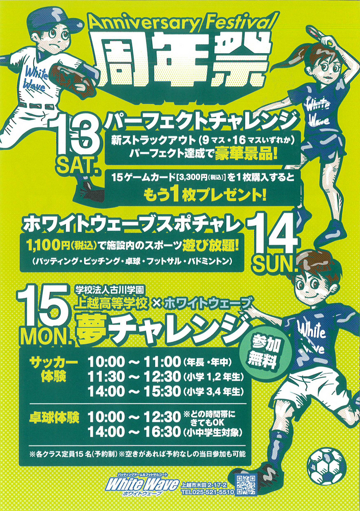 7/15(日)に上越高校サッカー部スポンサーのJマテ.グループ様とのコラボ企画「スポーツ夢チャレンジ」を、WHITEWAVE(上越市木田2)にて実施します。 本校サッカー部・卓球部の選手が体験教室を行います。参加エントリーお待ちしております!