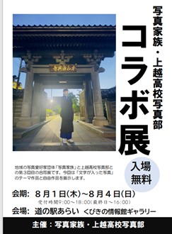 上越高校写真部と地域の写真愛好団体「写真家族」とのコラボ展を実施しています。 お近くにお越しの際はお立ち寄りいただけると嬉しいです。 【コラボ展】 期間:2024年8月1日(木)~8月4日(日) 9時~18時 ※最終日16時まで 会場:道の駅あらい「くびき野情報館ギャラリー」