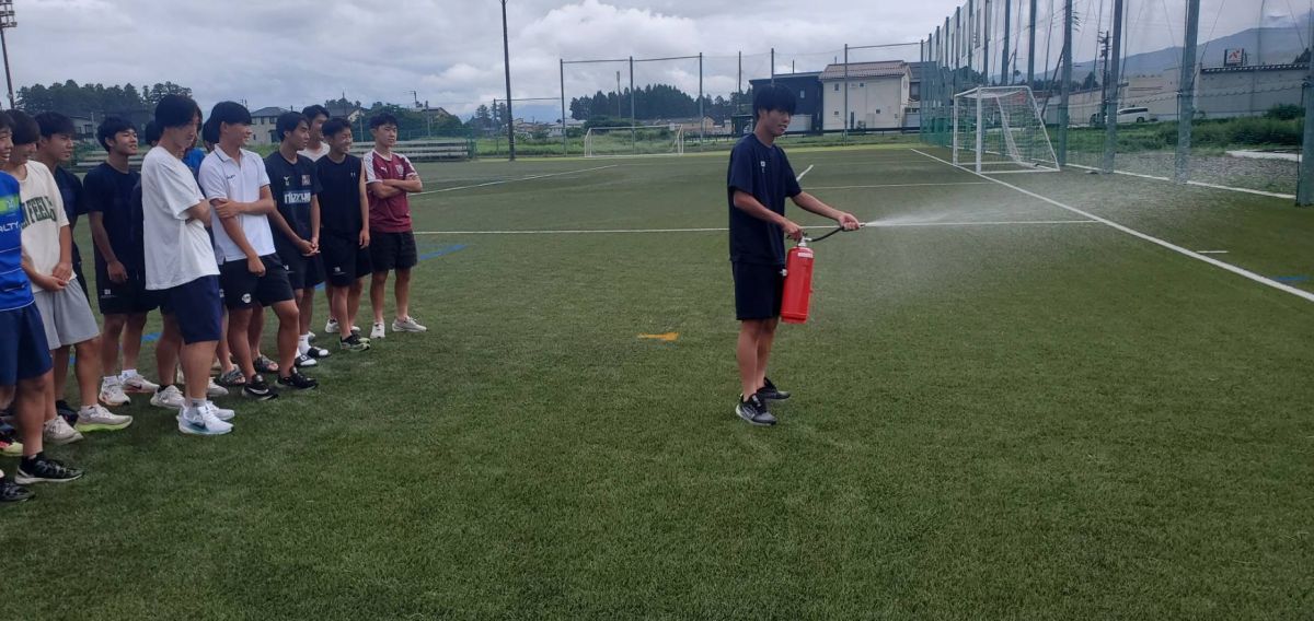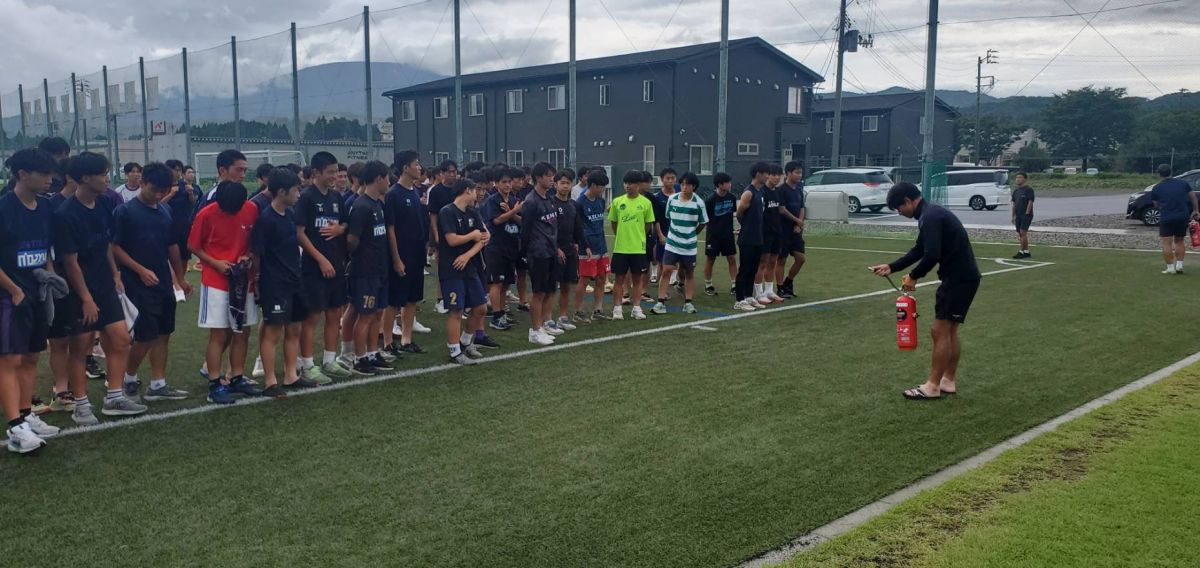 8/31(土)、生徒寮にて、寮生とサッカー部スタッフを対象とした「避難・消防訓練」を実施しました。 訓練では、消防署への出火通報、グラウンドへの避難、消火器取り扱いの説明も受けました。 今年度初めての訓練でしたが、的確な避難経路から迅速に避難し、点呼もスムーズに完了しました。 今回の訓練を通して、さらに火災への危機意識、防災意識の向上を図ることができました。