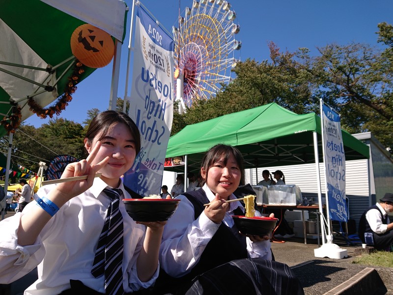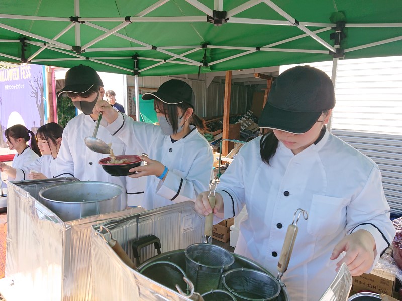 10月14日に料理部と写真部が妙高サンシャインランドでコラボイベントを実施しました。料理部は酒粕とんポタみそラーメンの販売、写真部はオリジナルフォトフレーム作りのワークショップを行いました。