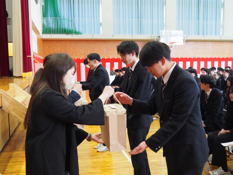 2月28日(金)、卒業式を前に同窓会入会式が行われました。 同窓会長は、「これからは同窓生として、上越高校や地域の発展に尽力してほしい。活躍を期待している」と卒業生へはなむけの言葉を送りました。 卒業生を代表して、小林晃大さんが「同窓生として、母校の発展に関わっていきます」と入会の言葉を述べました。 最後に、同窓会役員のみなさんから、卒業生の門出を祝って卒業記念品が贈られました。
