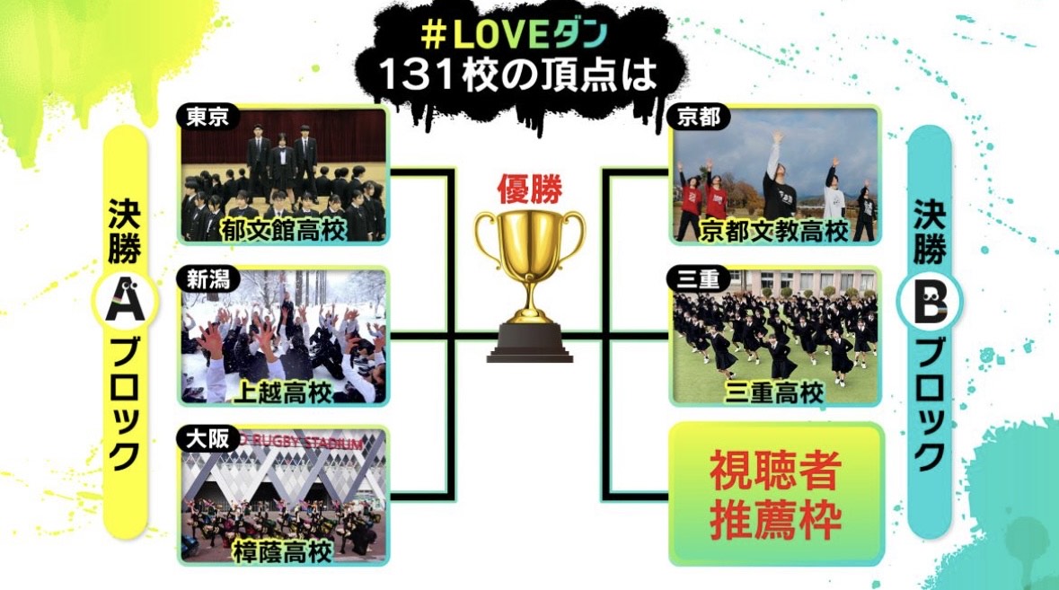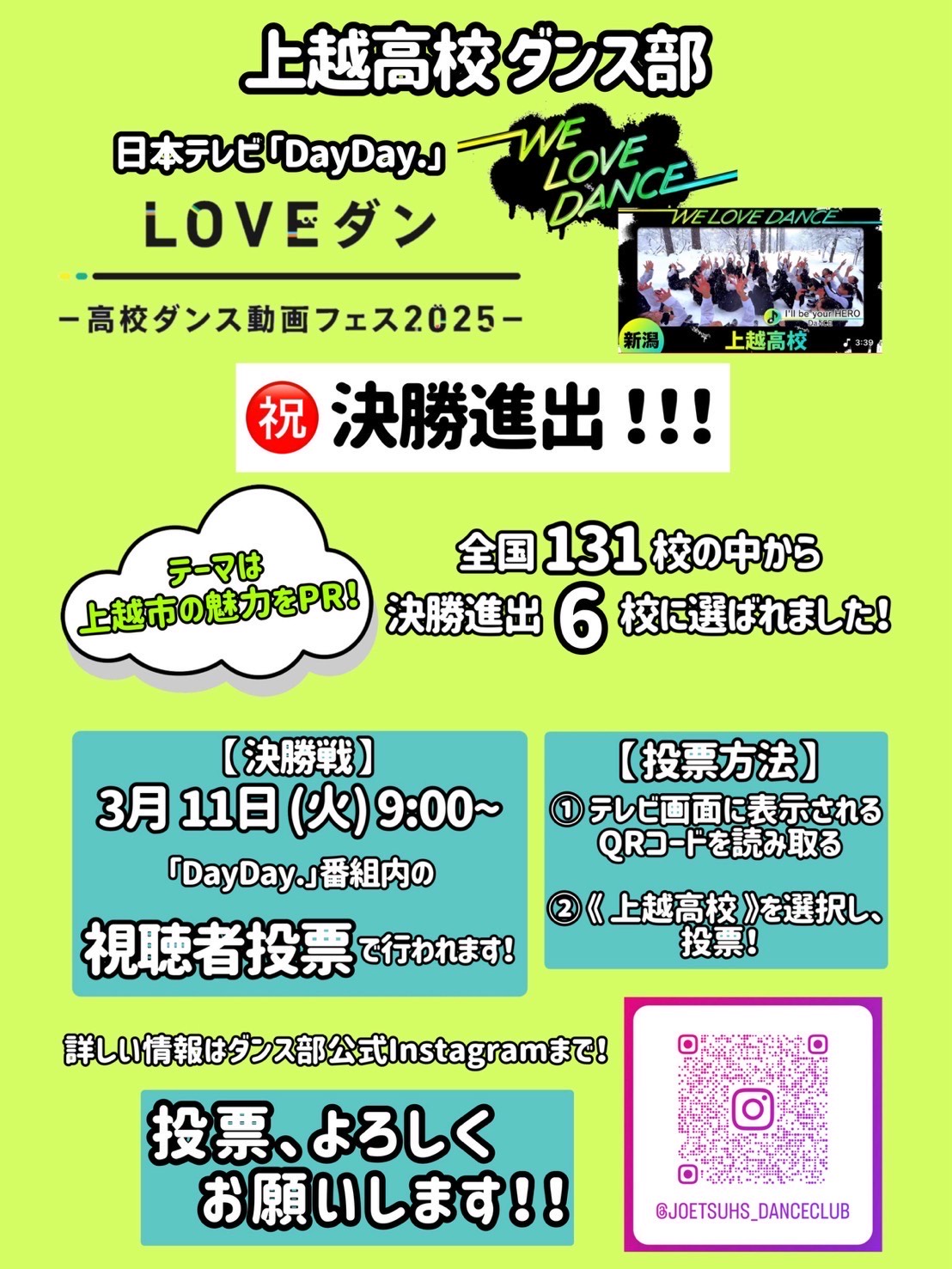日本テレビ「DayDay.」の企画である「LOVEダン」にダンス部が参加したところ、参加した131校のうち上位5チームに選ばれ、決勝トーナメント進出を決めました! 決勝トーナメントは、明日3月11日(火)9:00~「DayDay.」の番組内で行われ、視聴者投票で順位が決まります! 「LOVEダン」のコーナーは9:40頃からの予定です。 ぜひご覧いただき、投票よろしくお願いいたします!!!
