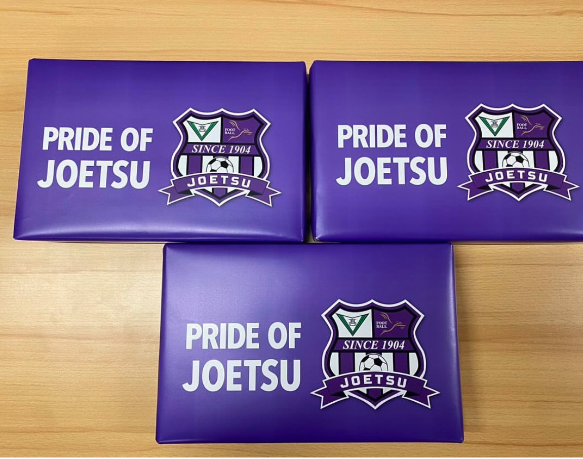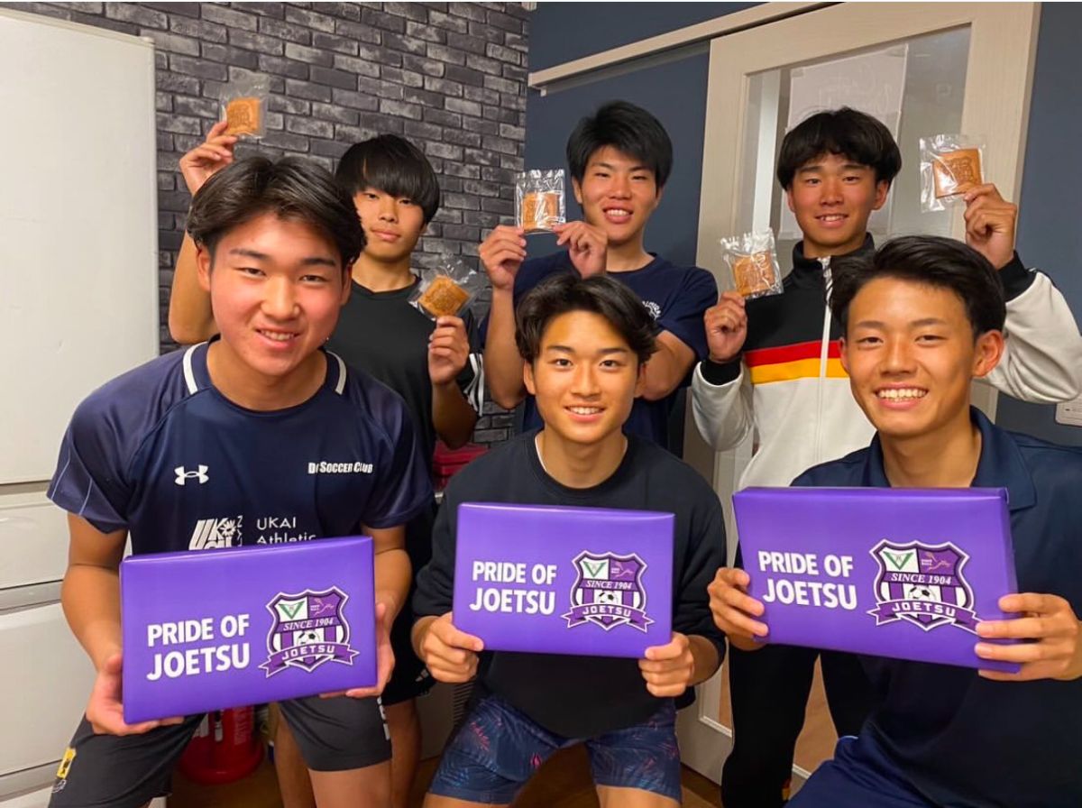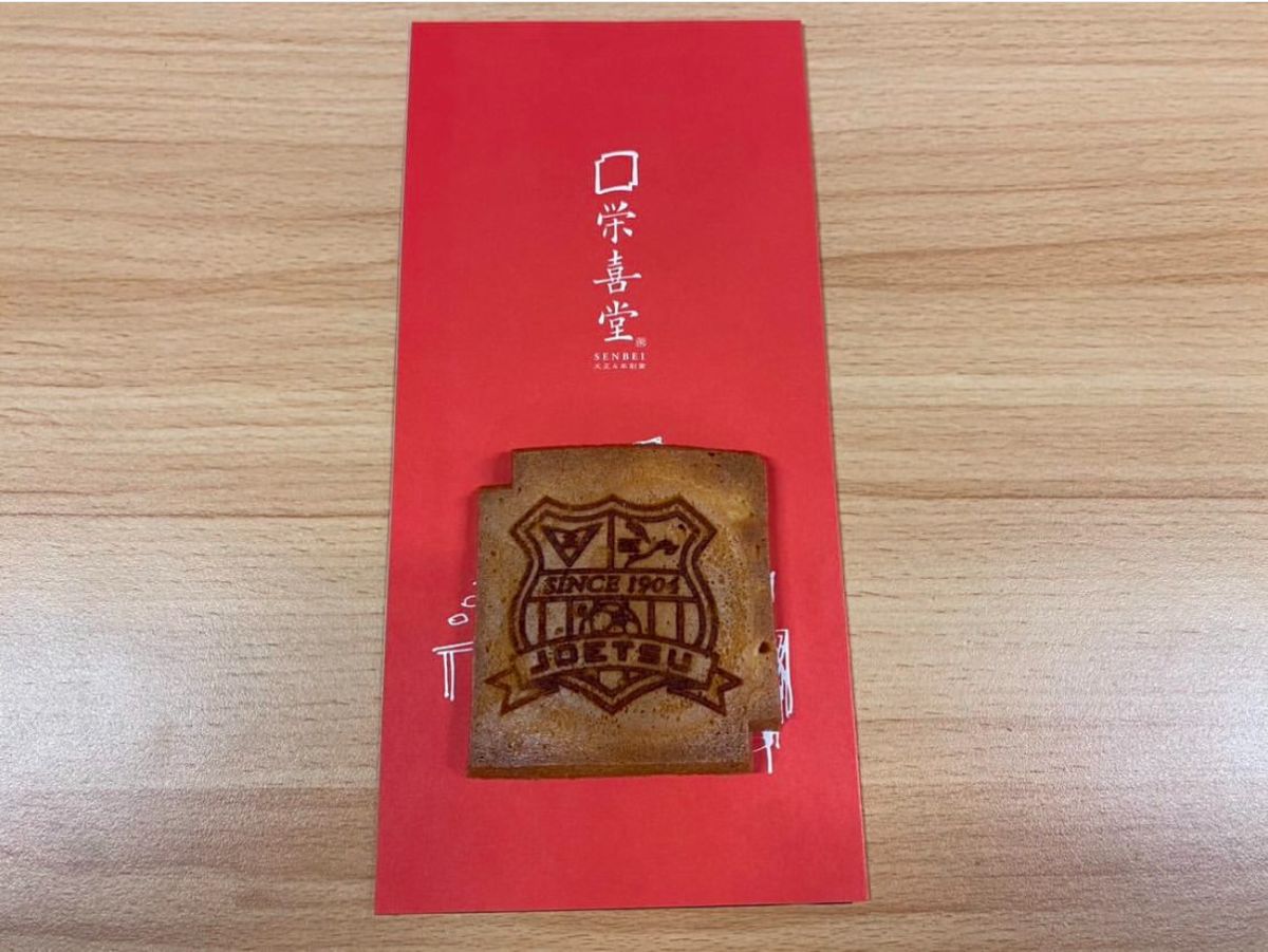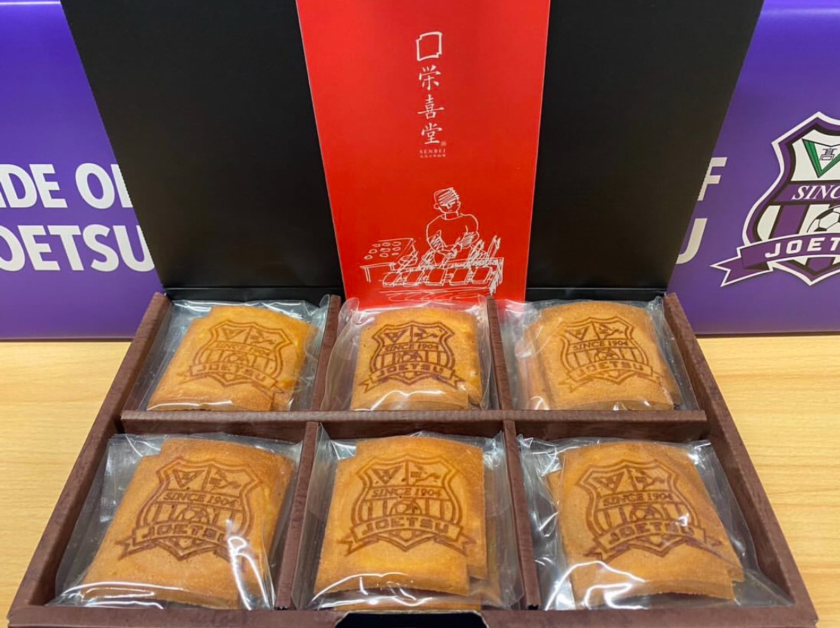 本企画は、「上越を盛り上げたい」という共通の想いからスタートしました。今後は、遠征時のお土産としてお渡しするほか、ホームゲームなどでも定期的に販売を予定しております。栄喜堂菓子店の名物"瓦せんべい”に、上越高校サッカー部のロゴを刻印し、パッケージも特別なデザインに仕上げた、完全オリジナルの逸品です。