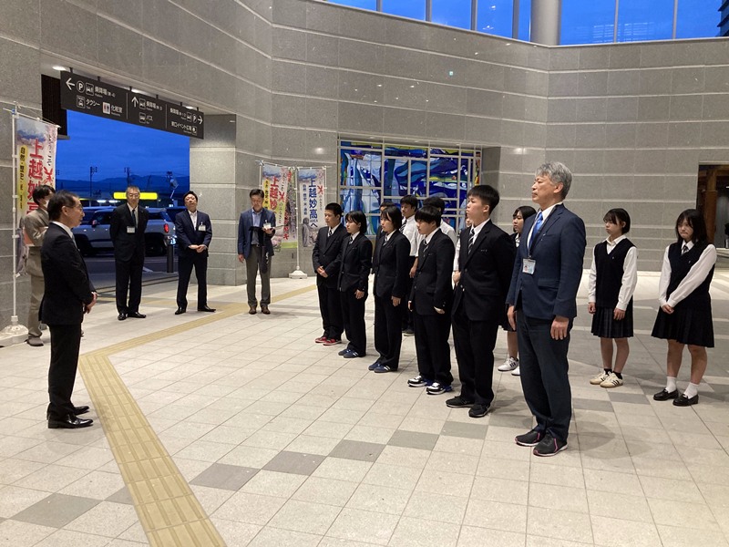 10月10日(金)に、柔道部の生徒5名がドイツのカールスルーエに向け出発しました。上越市が主体となって行っているドイツ交流事業の一環で、上越妙高駅で行われた出発式では、代表生徒から本事業参加に対する決意表明が行われました。