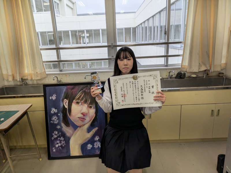 今年度の上越市美術展覧会(市展)で美術部3年生の大島瀬奈さんの作品が新潟日報美術振興賞を受賞しました。多くの作品が出品されている中で、高い評価を頂くことができました。