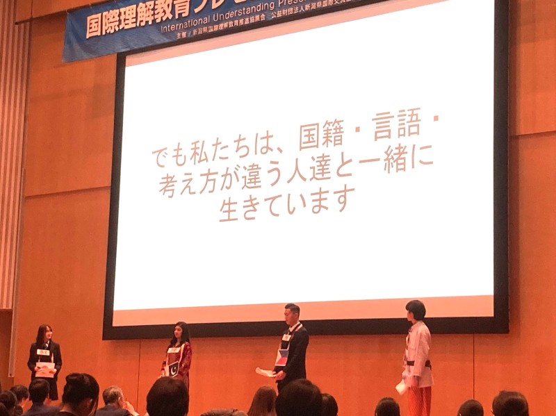 12月21日(日)、朱鷺メッセ国際会議場で行われた国際理解教育プレゼンテーションコンテストに、1年生の「水ナスマカロン」と、2年生の「チャクラ」の2チームが出場しました。 1年生が「日本と世界の生活水の問題」、2年生が「日本における多文化共生」について、堂々としたプレゼンを行い、「水ナスマカロン」が審査員奨励賞を受賞しました。