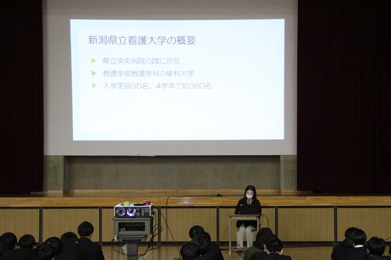 12月7日(水)に新潟県立看護大学と新潟工科大学の学生から講話をいただきました。それぞれ大学でどのように学習・研究を行っているのかわかりやすく解説していただきました。大学と高校の違いや研究に対する情熱などを学ぶことができました。